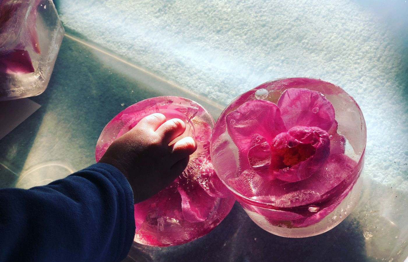 - Take the ice blocks out of the freezer with your child and talk about how they look in the ice.